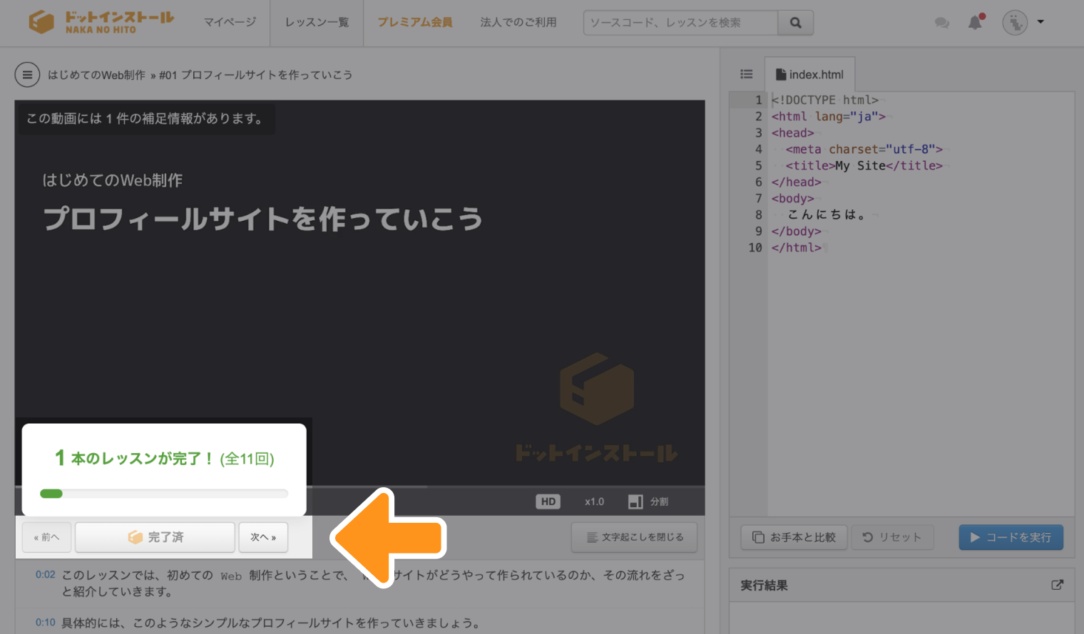 動画を見た後に「完了」ボタンをクリックすると、完了ボタンの上で進捗グラフが進みます(ユーザー登録が必要です)。完了ボタンは以下の場所にあります。