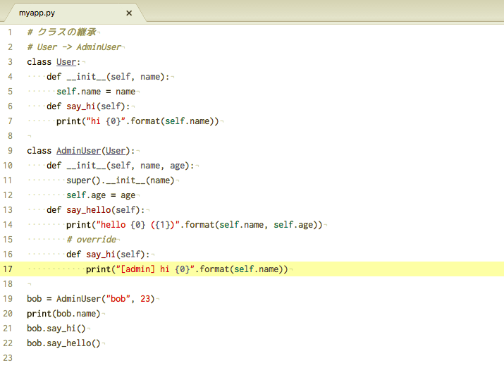 レッスンの通りに進めているのですが、どうしても AdminUser クラスの say_hi() が意図した通りに実行されません。ソースコードに間違いがあるのでしょうか?解決方法を教えてください。