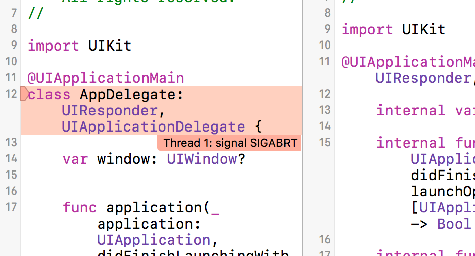 ビルドすると以下のように「Thread 1:signal SIGABRT」というエラーが出てシミュレータが動作しません。原因は何でしょうか?